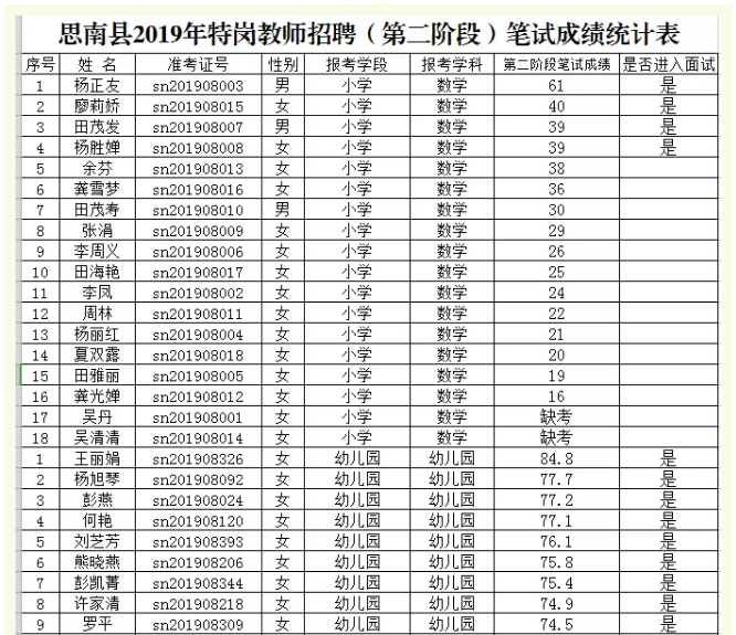 根據(jù)《思南縣2019年農(nóng)村義務(wù)教育階段學(xué)校教師特設(shè)崗位計劃招聘實施方案》,思南縣2019年特崗教師招聘(第二階段)筆試已于2019年8月3日進(jìn)行,現(xiàn)將筆試成績和進(jìn)入面試人員名單予以公示。請進(jìn)入面試人員于2019年8月8日上午8點前憑本人有效身份證和筆試準(zhǔn)考證到思南中學(xué)初中部(思南中學(xué)老校區(qū))參加面試。(統(tǒng)一從學(xué)校后校門進(jìn)入)。、